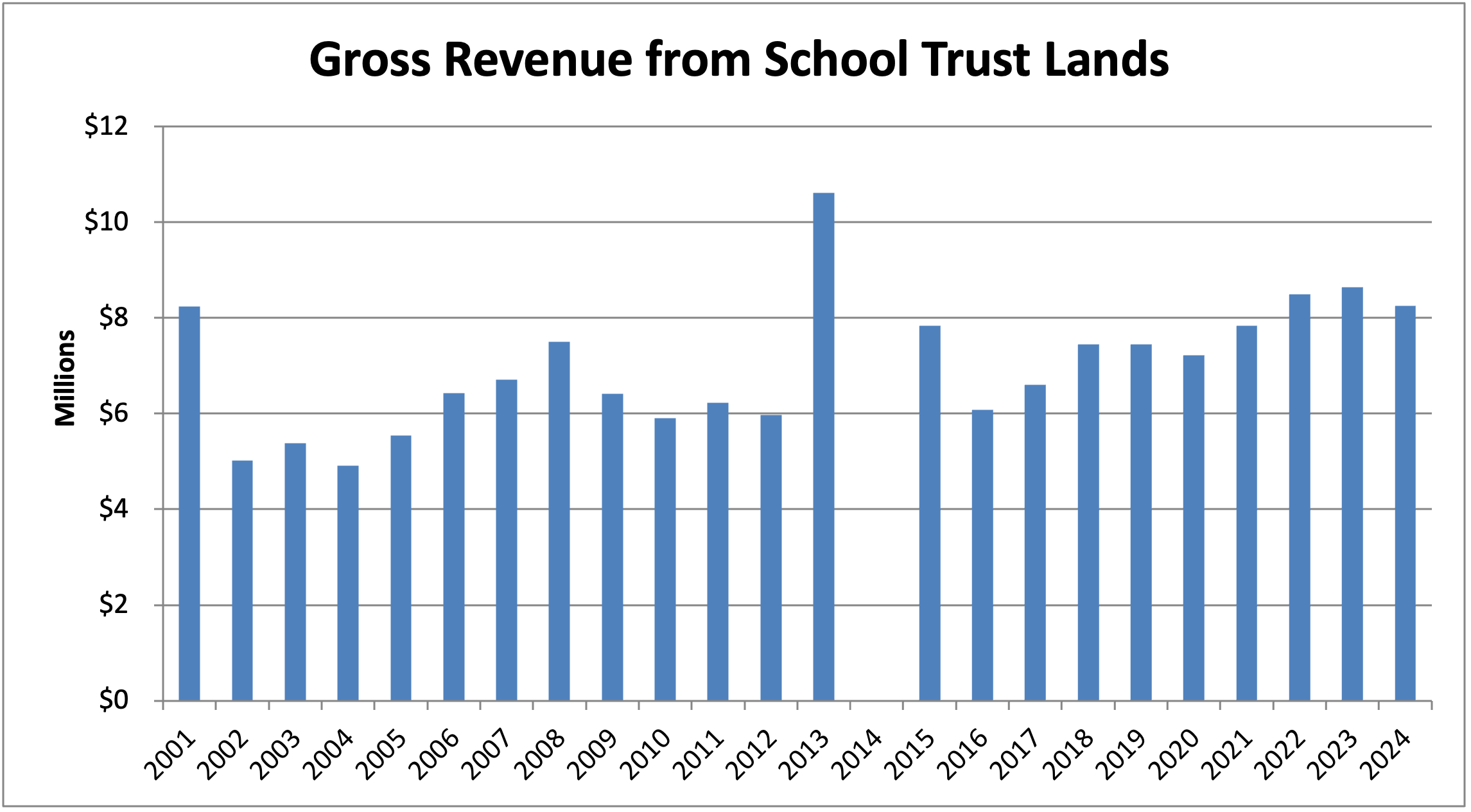 Annual revenue from these lands in FY 2024 was $8,256,633. By far the largest revenue source is geothermal steam with additional contributions from oil, gas, and other minerals. A much smaller contribution came from surface leases for wind, solar, and forestry on the school trust lands.