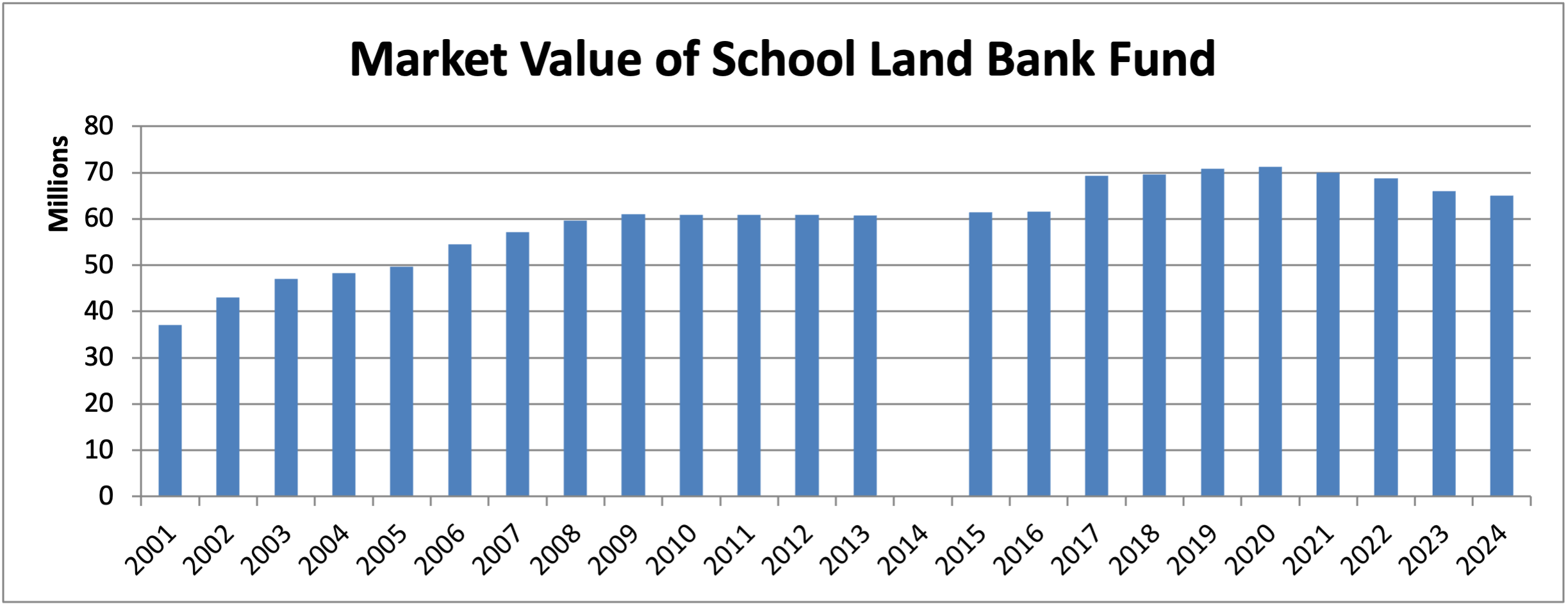 Net revenue from activities on the school trust lands is deposited in the School Land Bank Fund. [1] The market value of the fund is $64,965,889 as of June 30, 2024. The state borrowed $59 million of the $61 million invested in the School Land Bank Fund. The loan was repaid by June 30, 2016 with interest based on the rate generated by the Pooled Money Investment Account. Most of the states east of the Mississippi River lost their school endowment funds when borrowed funds were never repaid. California is applauded for its commitment to their school trust by repaying the loan. The fund appears to be returning very small amounts from their investments while investments in equities by other states have provided double digit returns to school funds.
