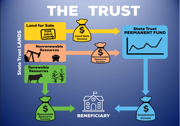 The chart below clearly shows that land sale and nonrenewable revenue—both of which are a revenue that can only occur once—are all saved and invested to provide a continuing revenue to future generations of schools. Revenue from activities that can be repeated on a given parcel such as ranching or agriculture are distributed to schools on an annual basis. Investments in the ever growing Permanent School Fund are then distributed annually to schools. The chart below clearly shows the flow of funds from the lands and to the K-12 schools.