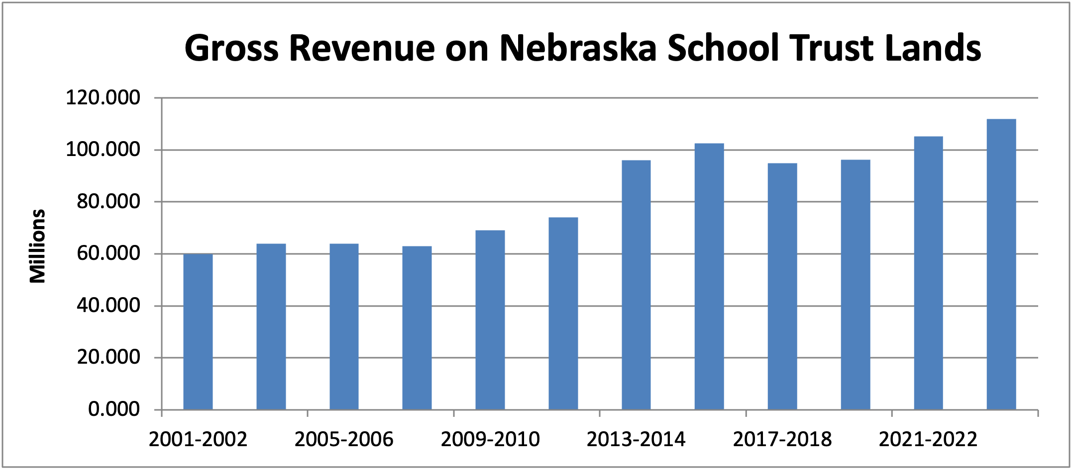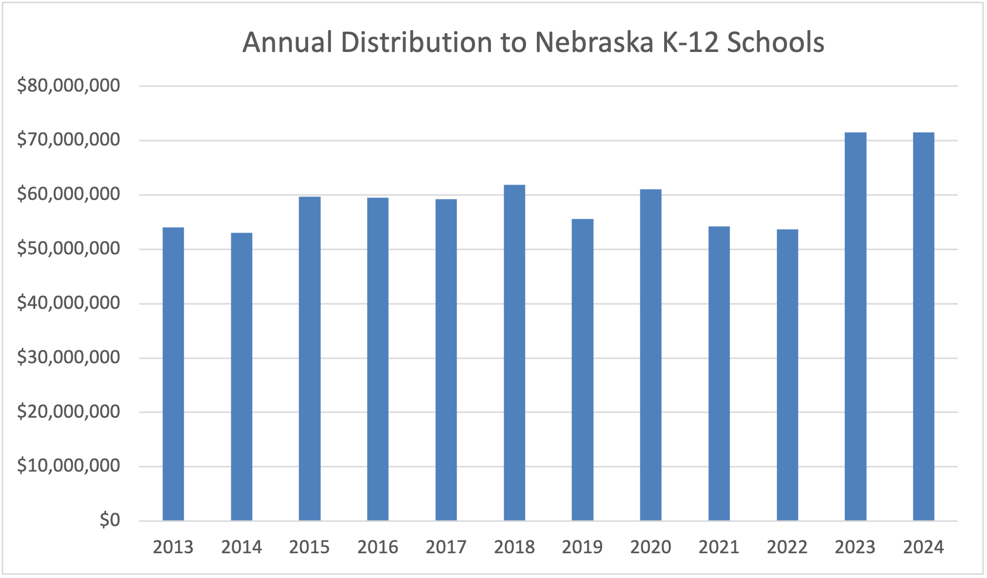 In Nebraska the revenue from the school trust lands is sent directly to the county school districts. The actual Enabling Act designates the “common schools” as the beneficiary. It is unclear from reading the annual report of the Board of educational Lands and Funds whether there is a mechanism to ensure the revenue goes to the “common schools” as required in the trust documents. Below is a chart depicting how much is distributed annually from the school trust.