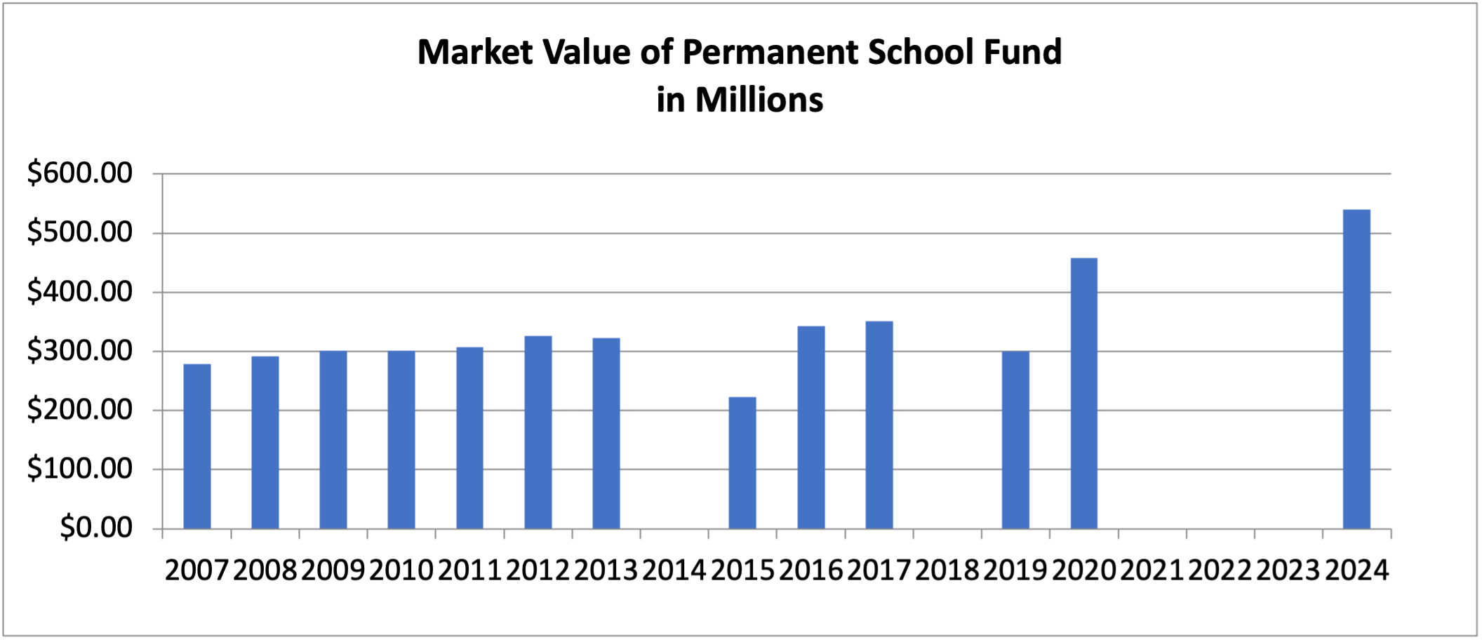 The Permanent School Fund is invested by the State Treasurer and has a market value of $539,960,000. Of this total $253 million is in fixed income investments; $266 million in public equity; and $21 million in private equity. The net annual return for FY2024 was 6.5%. In FY 2024 investment income of $16.1 million was distributed to schools in Nevada through the Nevada Distributive School Account.