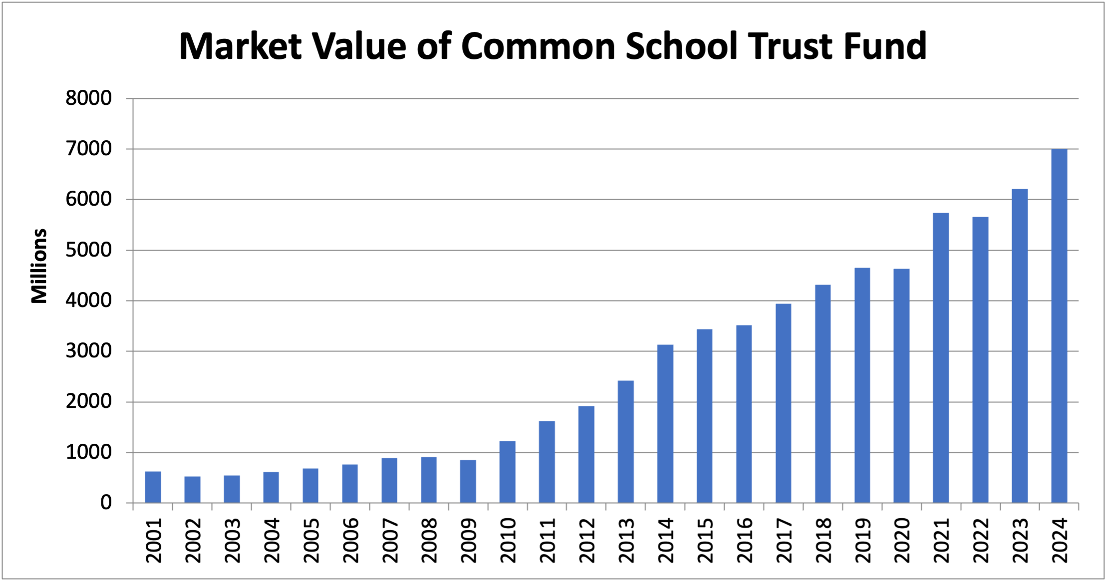 The North Dakota Common School Trust Fund has had phenomenal growth over the last 39 years, growing from a market value of just under $240 million to now being within a hair’s breath of being $7 billion—a growth of 2900%. As of June 30, 2025, the market value of the fund stands at $6,997,804,865. The fund is prudently invested and generating a total weighted 5-year return on investment of 5.68%.