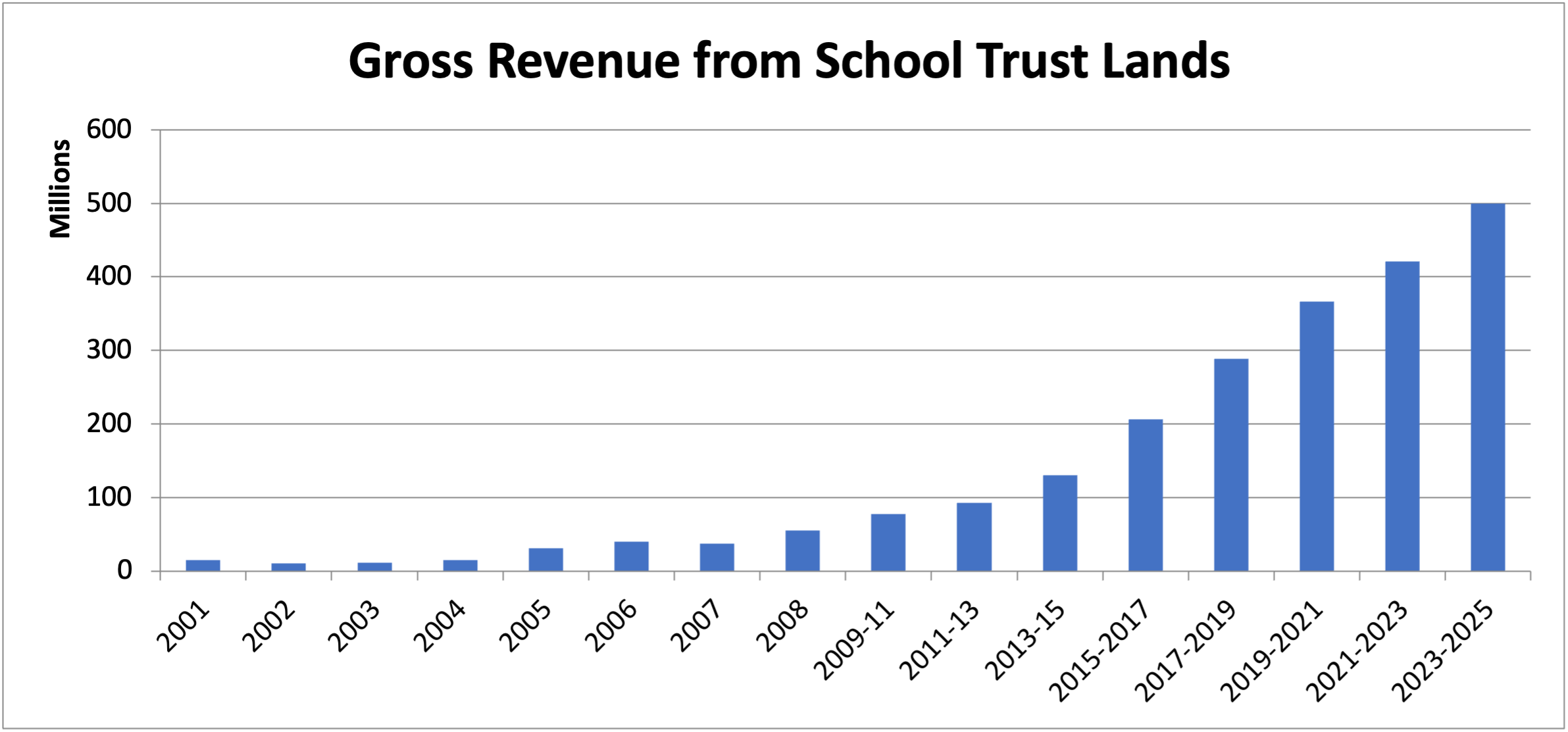 Investment income, oil and gas royalty payments, and the oil extraction tax dominate the revenue stream from the school lands. The Department of Trust Lands collects 1% per 30 days for all royalty payments based on the time value of money versus most states that charge a much lower interest rate. The agency also works with operators of low or non-producing wells to get the wells in production or let the lease expire. The agency has been an innovator in using Light Detection and Ranging technology, which can track the amount of product removed from surface mines using laser lights. This allows the agency to receive full payments for production on gravel pits and other surface mining. Their most significant accomplishment this year is the record K-12 distributions which have gone from $77 million in BIENNIUM 2009-2011 annually to $500 million in 16 years. PHENOMINAL! Only Wyoming distributes more per student than North Dakota.