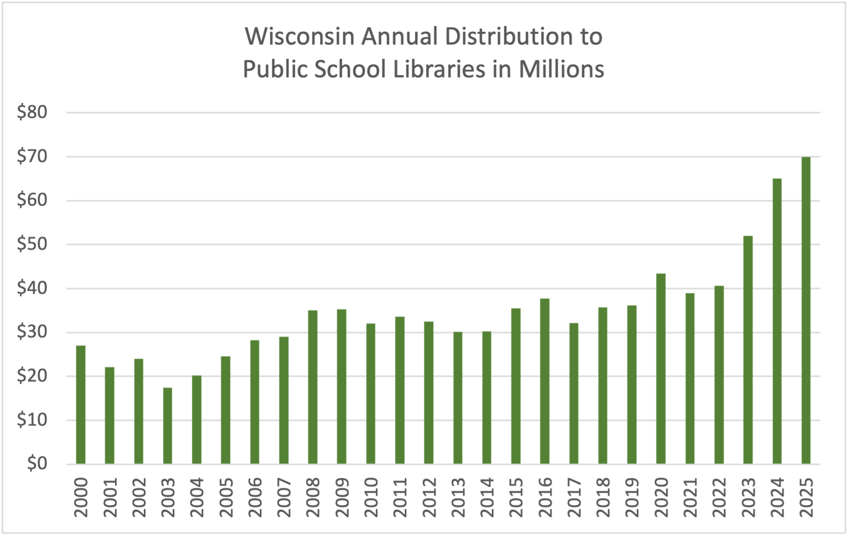 Interest paid on these loans is distributed for public school libraries. In FY 2025, $70 million was distributed. In most districts, these dollars represent the only funding available to purchase books, newspapers, periodicals, computers, web-based resources, and other library materials. The chart below shows the annual distributions to public school libraries obtained from the Wisconsin Department of Public Instruction website.